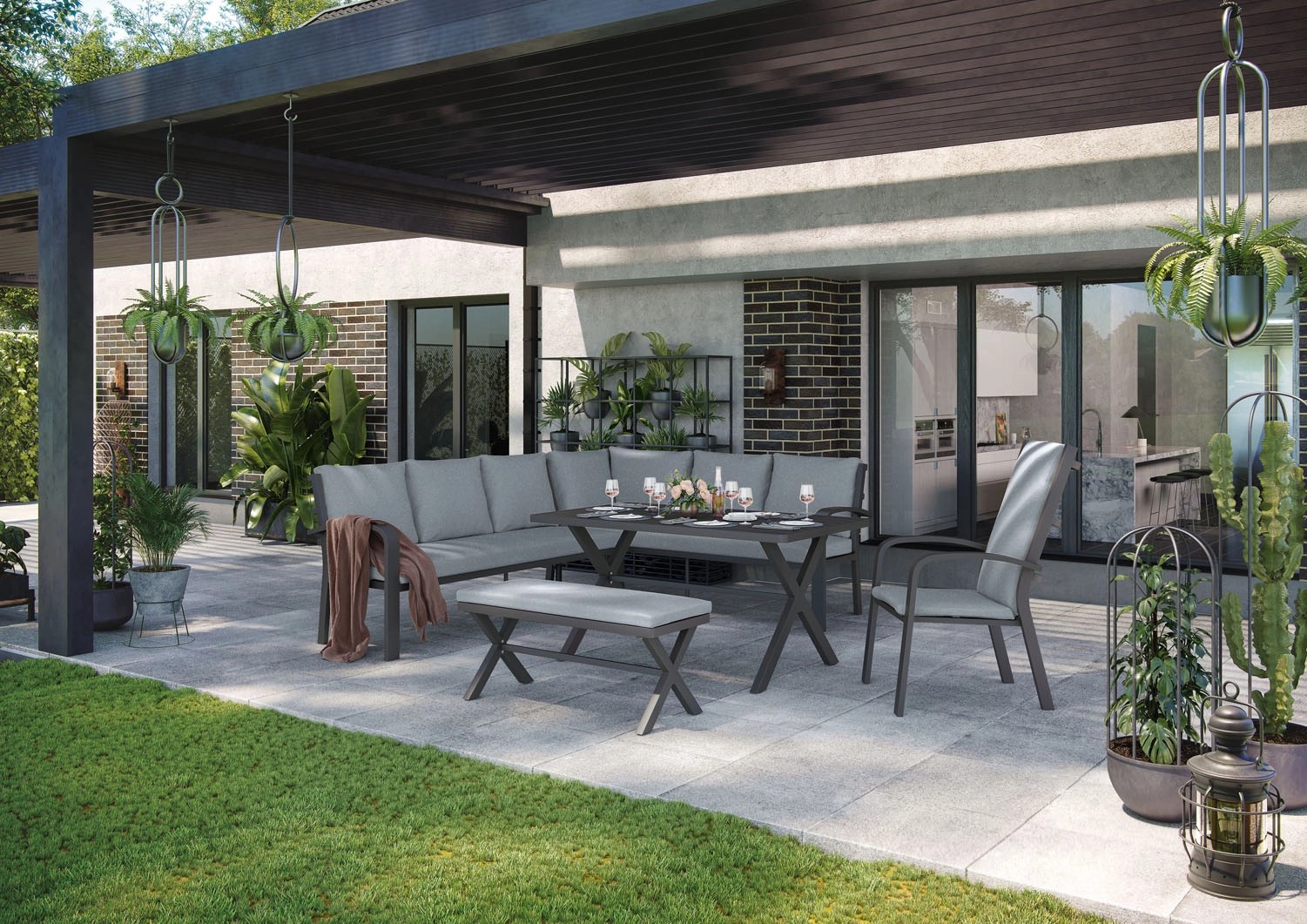 Do produkcji ram użyto trwałego, malowanego proszkowo aluminium. Dzięki temu utrzymanie czystości jest łatwe, a jednocześnie komplet prezentuje się elegancko i stylowo. W skład zestawu wchodzą ławka z prawym podłokietnikiem, narożnik z lewym podłokietnikiem, stół z krzyżowymi nogami, otoman z krzyżowymi nogami i pojedyncze krzesło. Użycie aluminium sprawia, że zestaw nie blaknie i nie traci swoich właściwości. Jest odporny na warunki atmosferyczne i odbarwienia. W zestawie znajdują się także poduszki z paskami do mocowania. Powłoki zostały wykonane z poliestru w szarym kolorze.