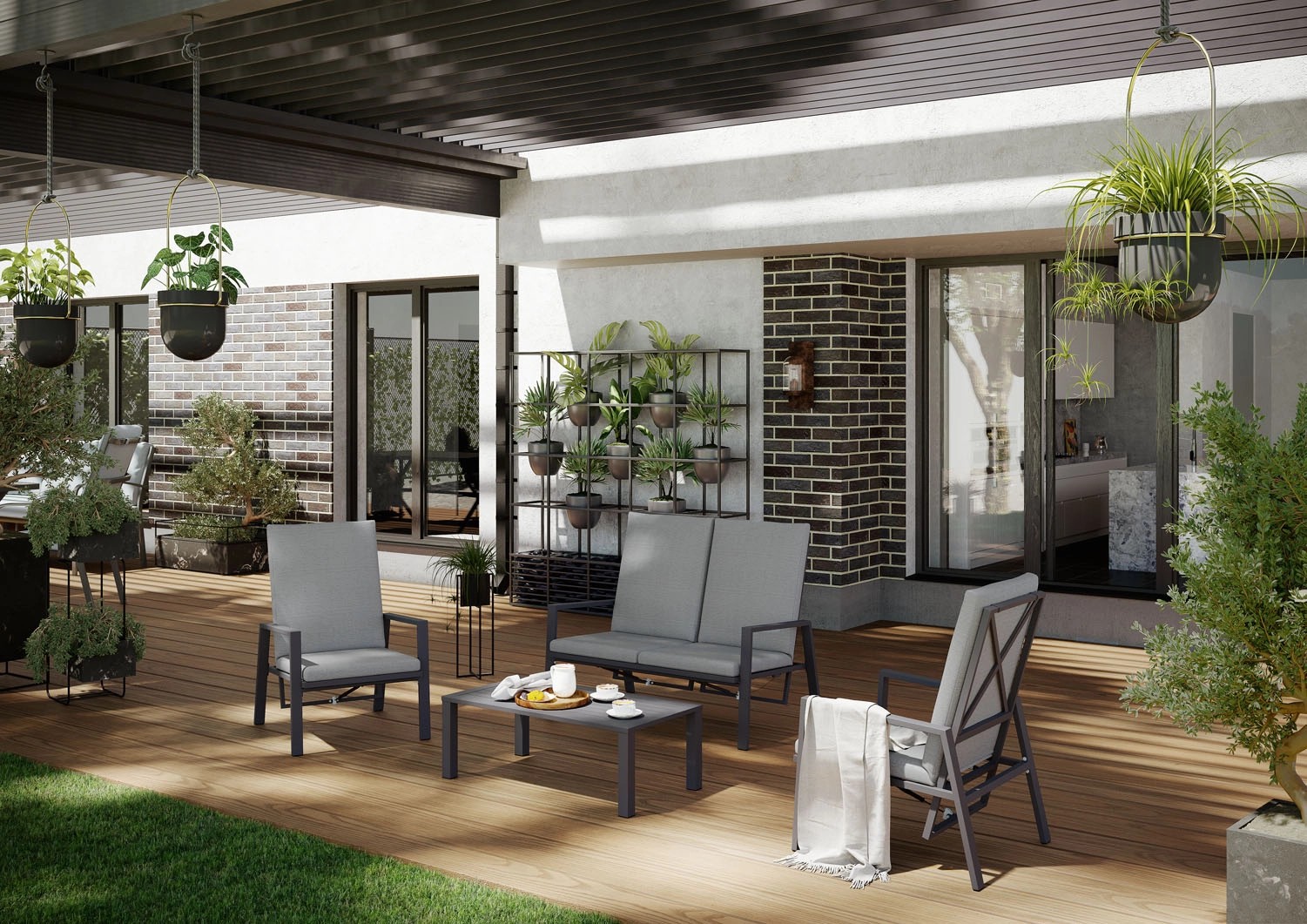 Czteroosobowy zestaw mebli wypoczynkowych wyróżnia się nowoczesnym wzornictwem i wygodą. Zapewnią Ci komfortowy wypoczynek na balkonie, tarasie czy w ogrodzie.