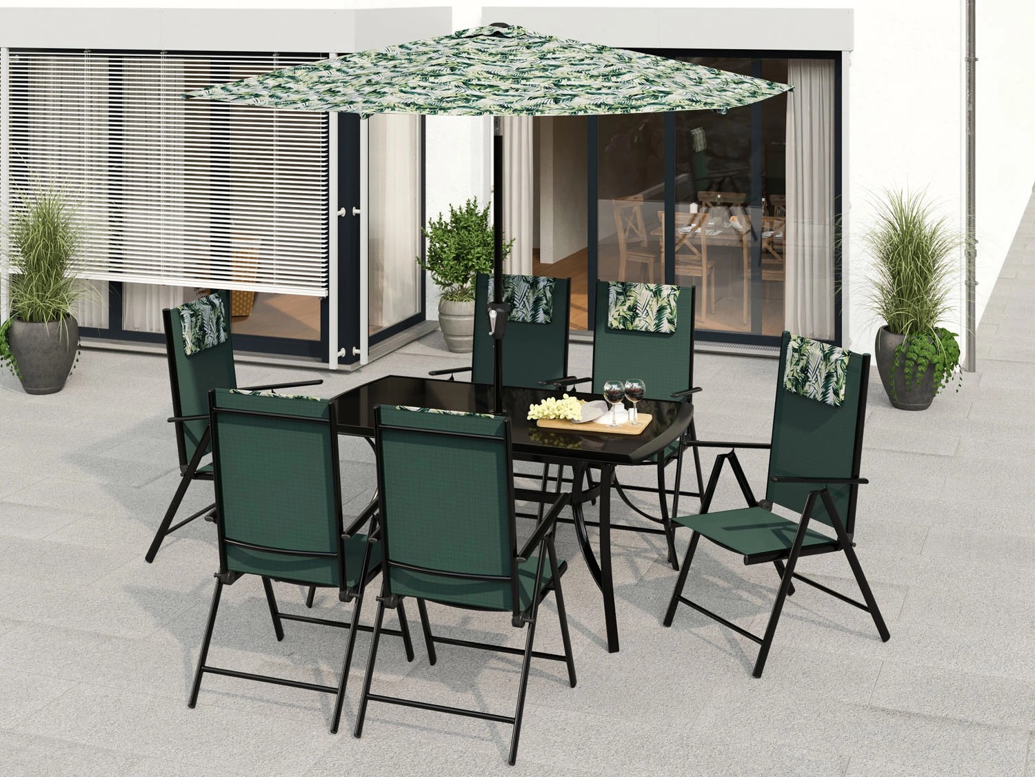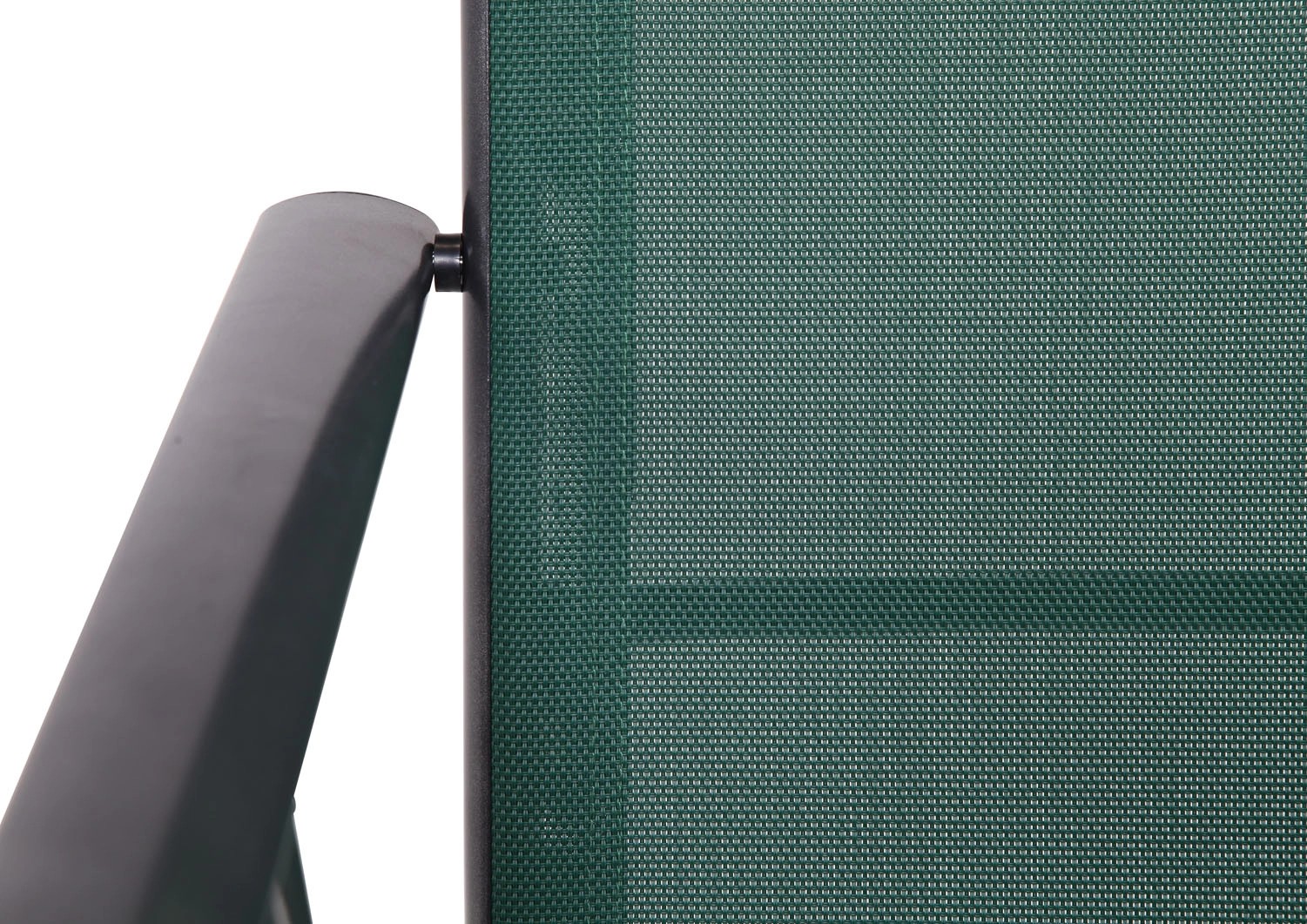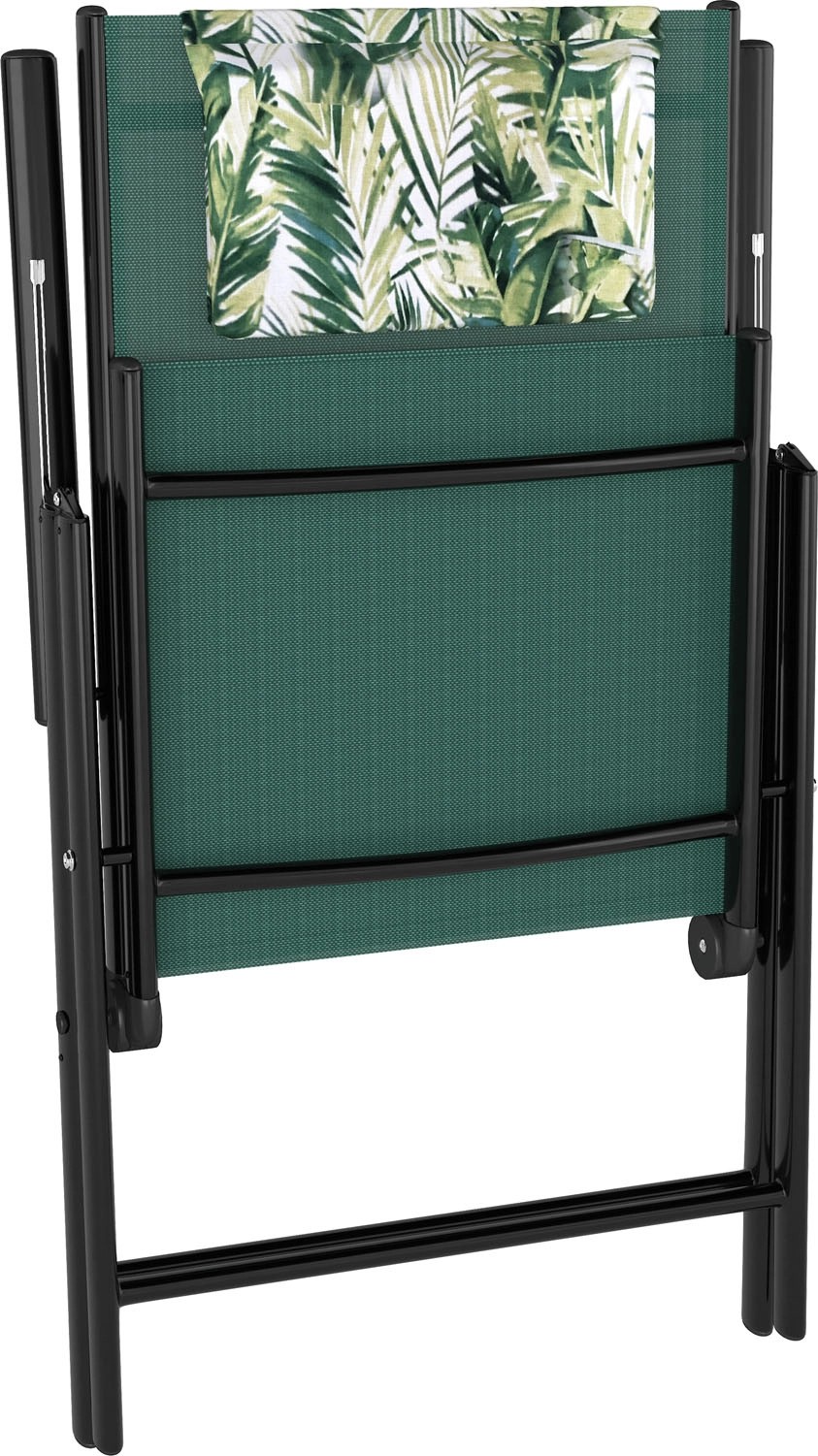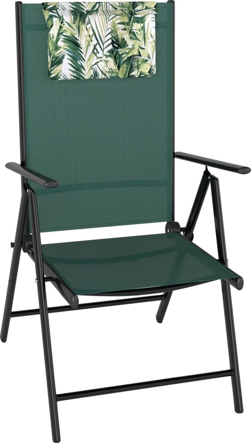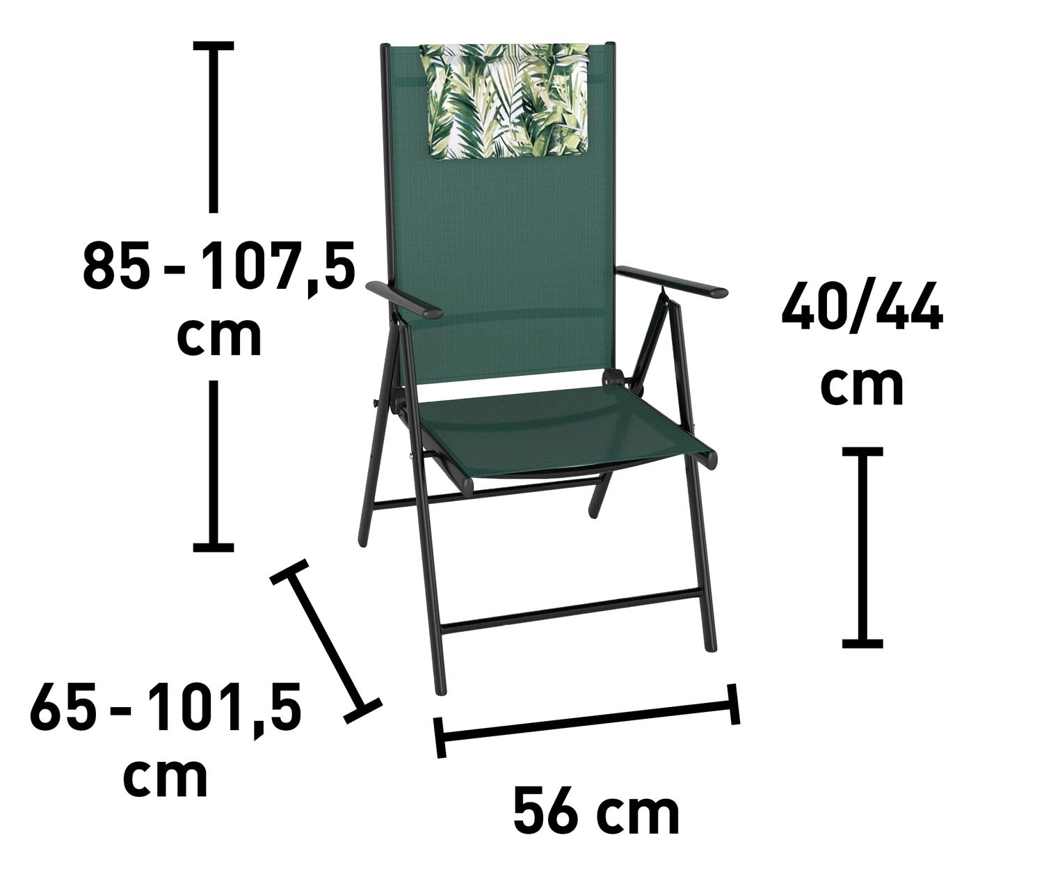 W zestawie znajdują się komfortowe i ergonomiczne krzesła wyposażone w wbudowane zagłówki. W trosce o wygodę użytkowania, meble posiadają oparcia z siedmiostopniową opcją regulacji oraz zaokrąglone podłokietniki. Krzesła są składane, co pozwala je łatwo przetransportować i schować, aby zaoszczędzić miejsce. Ramy wykonano z aluminium i stali, co gwarantuje nie tylko trwałość, ale także stabilność. Tekstylne oparcia i siedziska w kolorze zielonym nie wymagają specjalistycznej pielęgnacji, są łatwe w utrzymaniu czystości i trwałe.