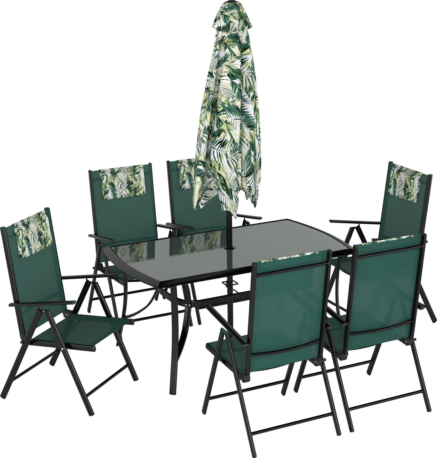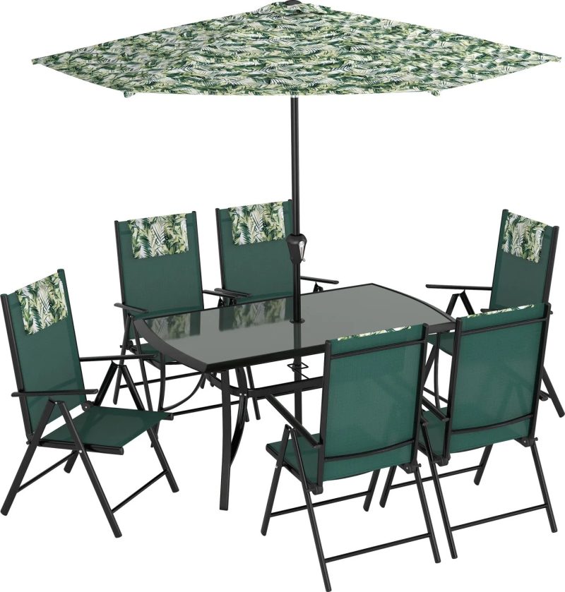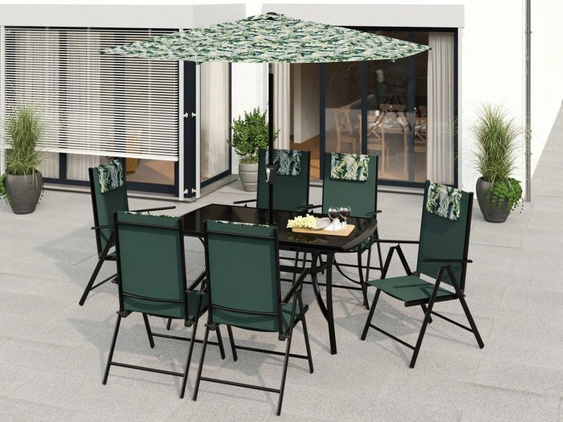 Komplet mebli ogrodowych z serii Travessa świetnie sprawdzi się jako kompleksowe wyposażenie ogrodu lub tarasu do wypoczynku czy spotkań. Zestaw składa się z sześciu regulowanych krzeseł oraz dużego stołu. W komplecie znajduje się także parasol, dzięki któremu bez obaw zorganizujesz przyjęcie także w przypadku niepogody. Zestaw łączy funkcje praktyczne i komfort użytkowania z elegancją oraz stylowym wyglądem.