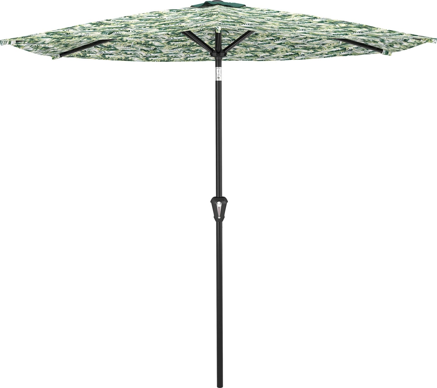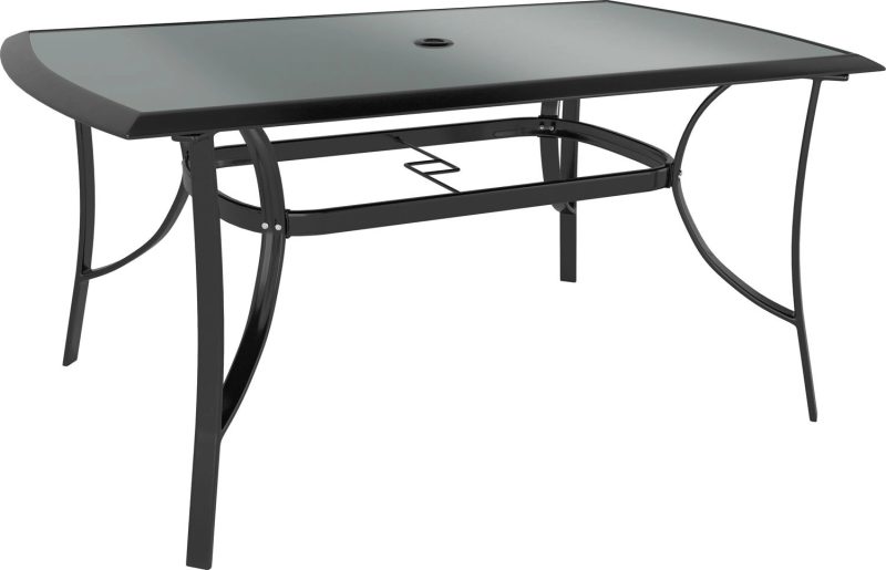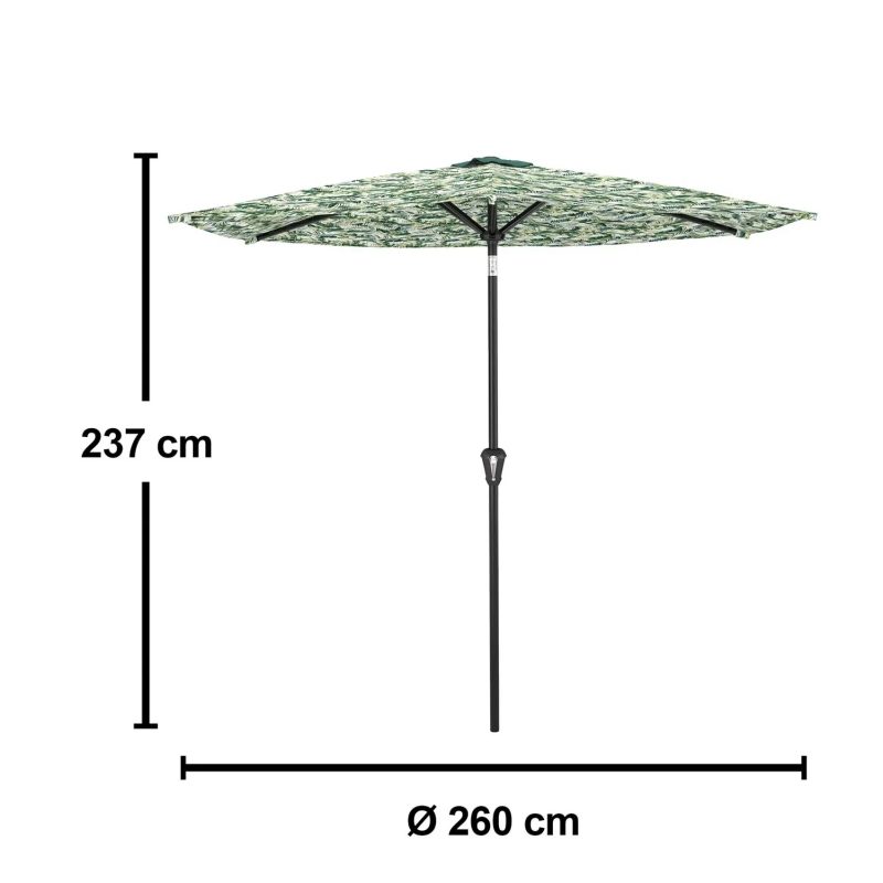 W stole zaprojektowano otwór na parasol, który znajduje się w zestawie. Okrągły parasol z mechanizmem otwierania na korbkę to niezwykle praktyczny element wyposażenia. Poliestrowe pokrycie parasola posiada filtr UV 50+. Stelaż wykonano z malowanej proszkowo ramy stalowo-aluminiowej.