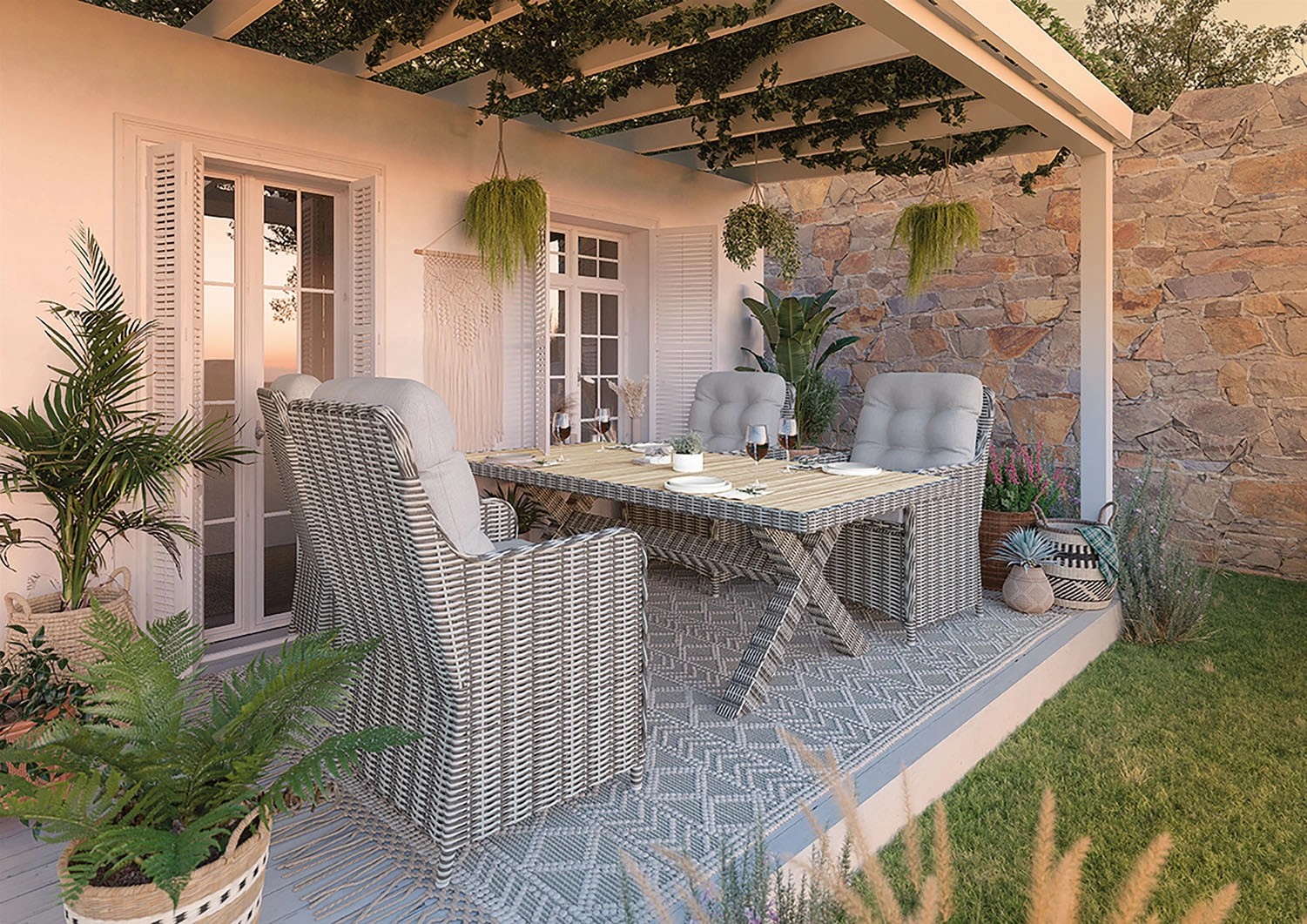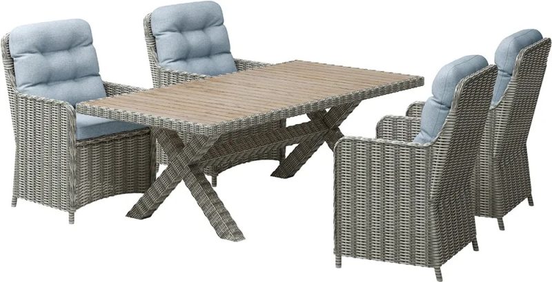 Komplet mebli ogrodowych GERALDTON składa się z 4 wygodnych foteli oraz wysokiego stołu. Meble wyróżniają się ponadczasową elegancją nawiązującą do rustykalnego stylu. Splot technorattanu dobrze komponuje się z roślinnością ogrodu.