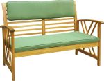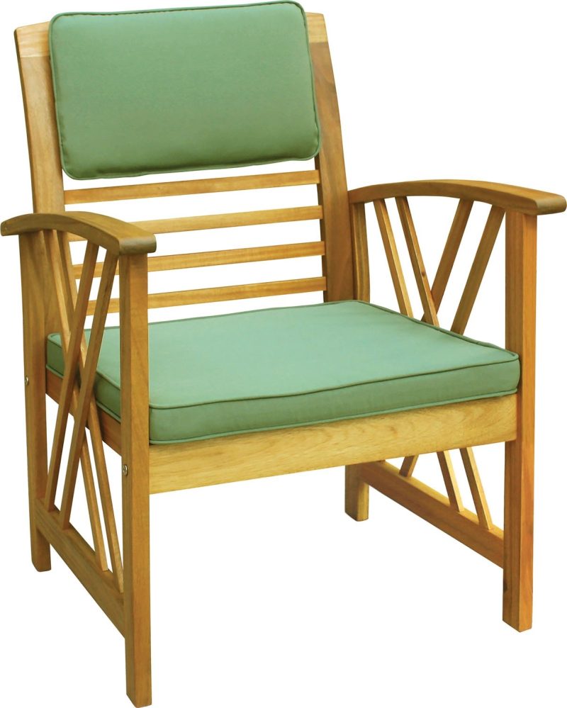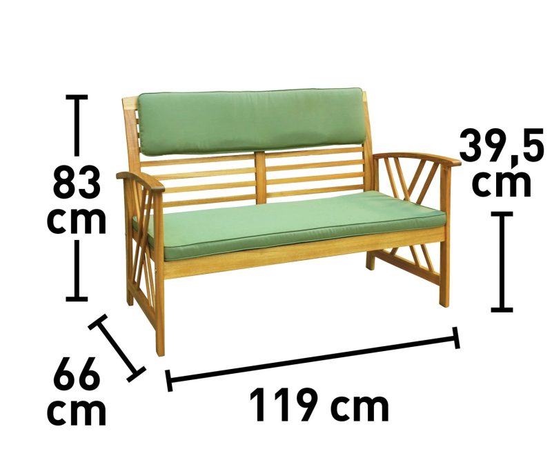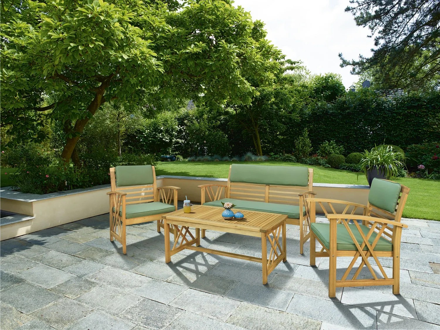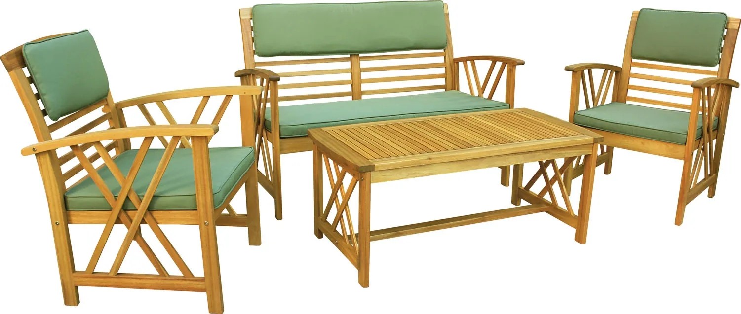 Komplet mebli Alfeans to czteroelementowy zestaw wypoczynkowy z dodatkami w kolorze zielonym. Wykonany został z ekologicznie pozyskiwanego drewna akacjowego. Nowoczesny design sprawia, że będzie piękną ozdobą ogrodu i idealnym miejscem na relaks.