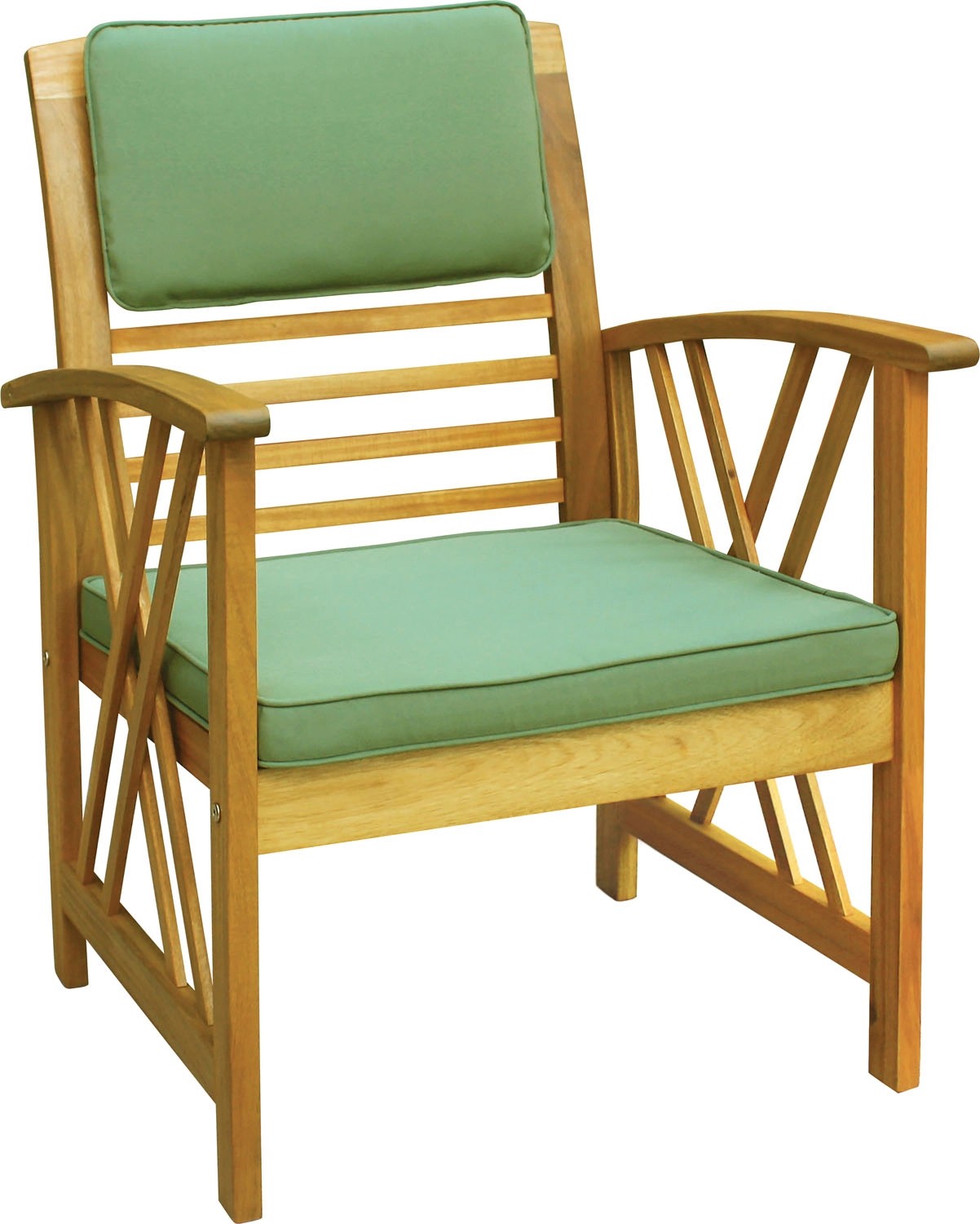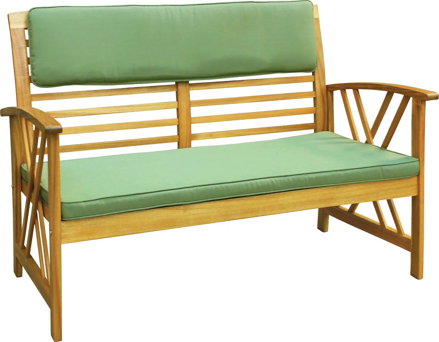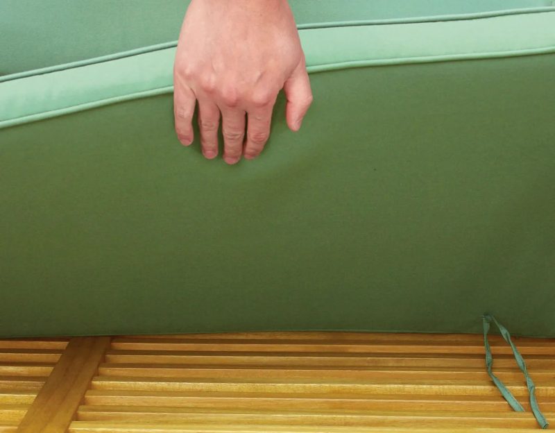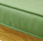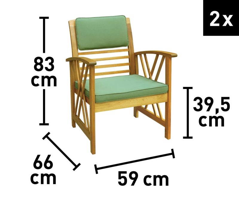W zestawie znajdują się poliestrowe poduszki na siedziska i oparcia w kolorze zielonym. Mocuje się je do stelażu za pomocą wiązań.