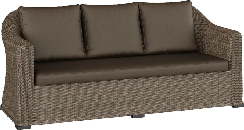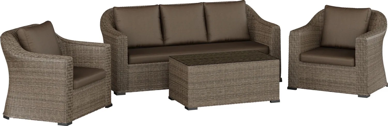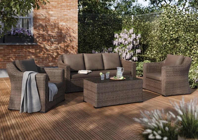 Stylowy 4-elementowy zestaw mebli ogrodowych, składający się z przestronnej 3-osobowej sofy, dwóch wygodnych foteli i praktycznego stolika.