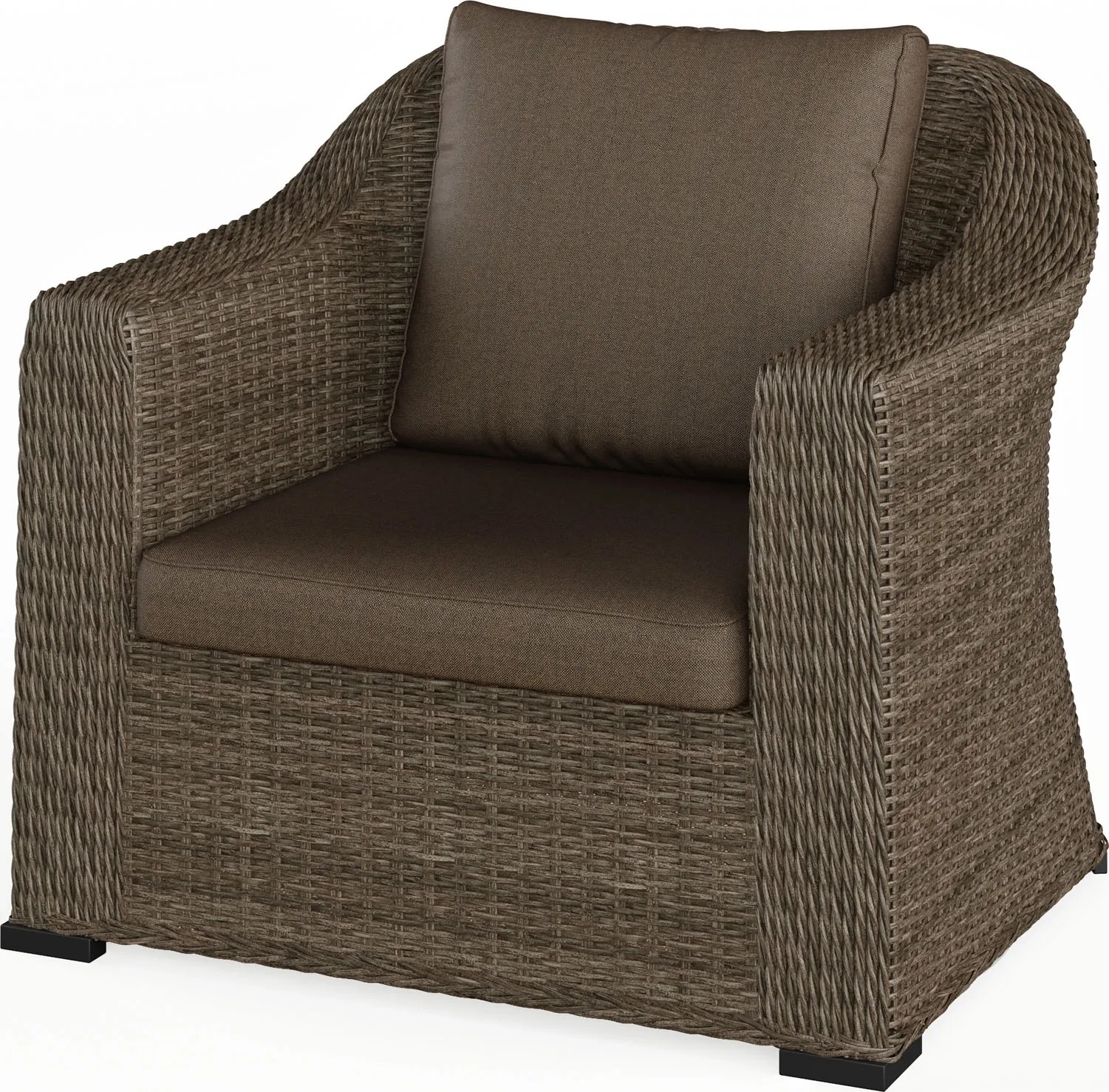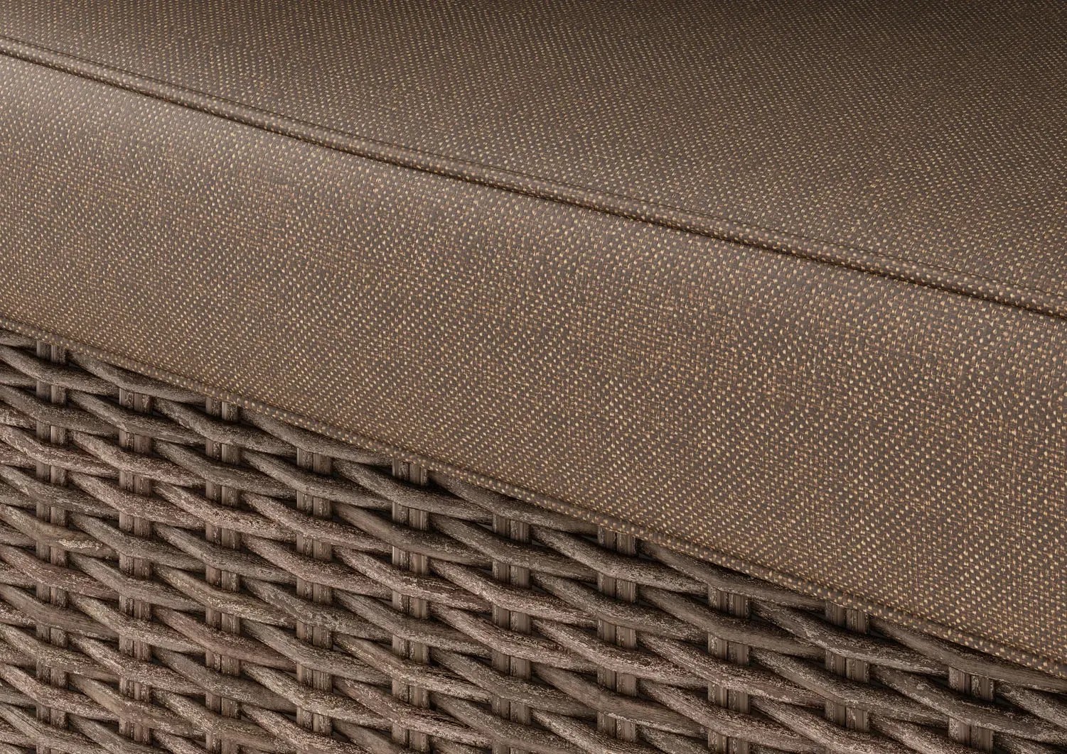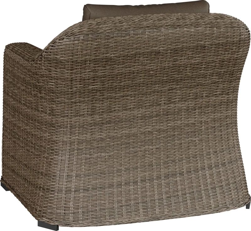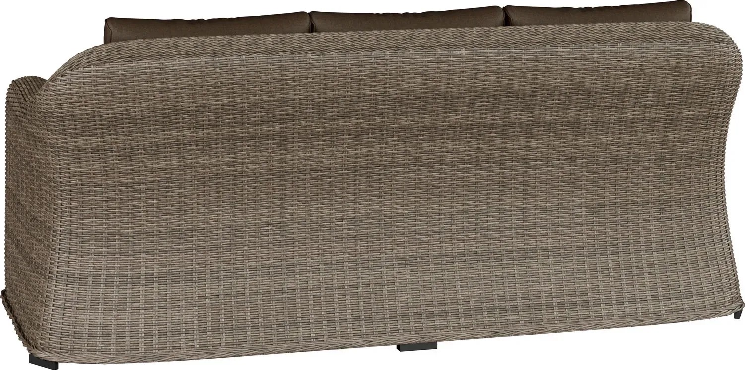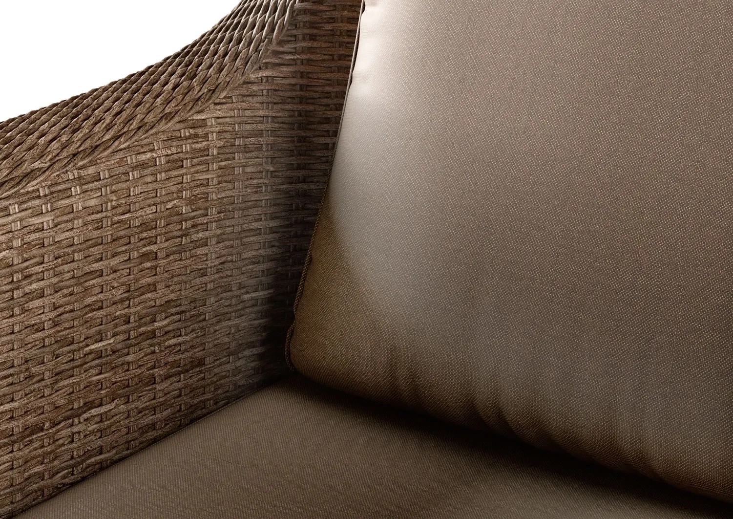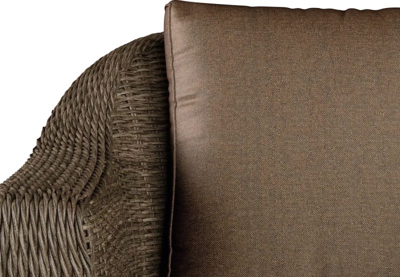Ciepła kolorystyka wikliny i poduszek tworzy uniwersalne połączenie, które pasuje zarówno do nowoczesnych, jak i klasycznych przestrzeni zewnętrznych.