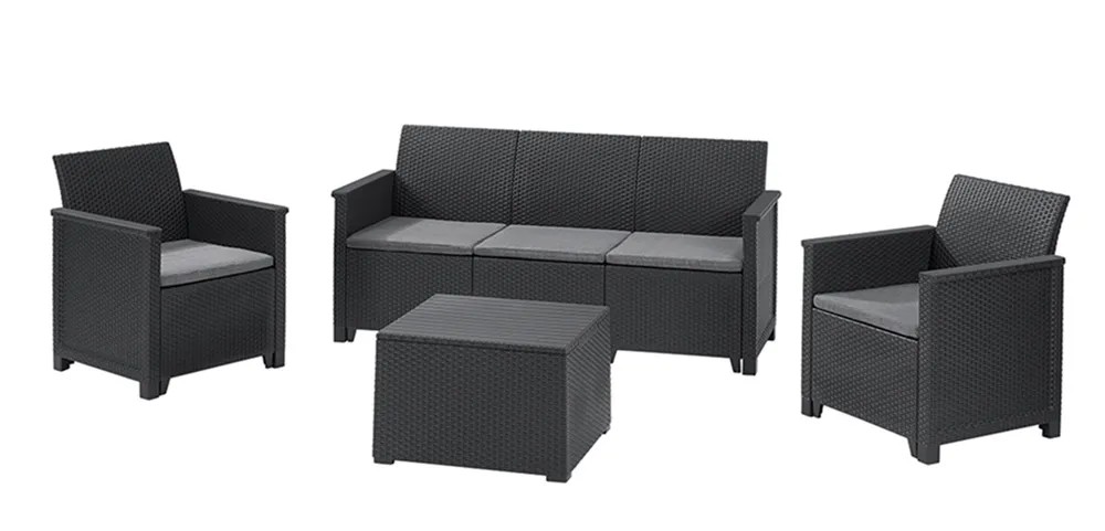 W skład zestawu wchodzą dwa fotele, 3-osoba sofa oraz praktyczny stolik kawowy. Dzięki mobilnemu stolikowi, fotele i sofę można ustawić dowolnie i swobodnie z niego korzystać. Stolik jest jednocześnie pojemną skrzynią, do której możesz schować np. poduszki siedziskowe wchodzące w skład zestawu. Dodatkowo jest bardzo stabilny, z powodzeniem więc można go ustawiać na każdym rodzaju powierzchni. Zestaw jest lekki, dzięki czemu możemy go dowolnie przestawiać.