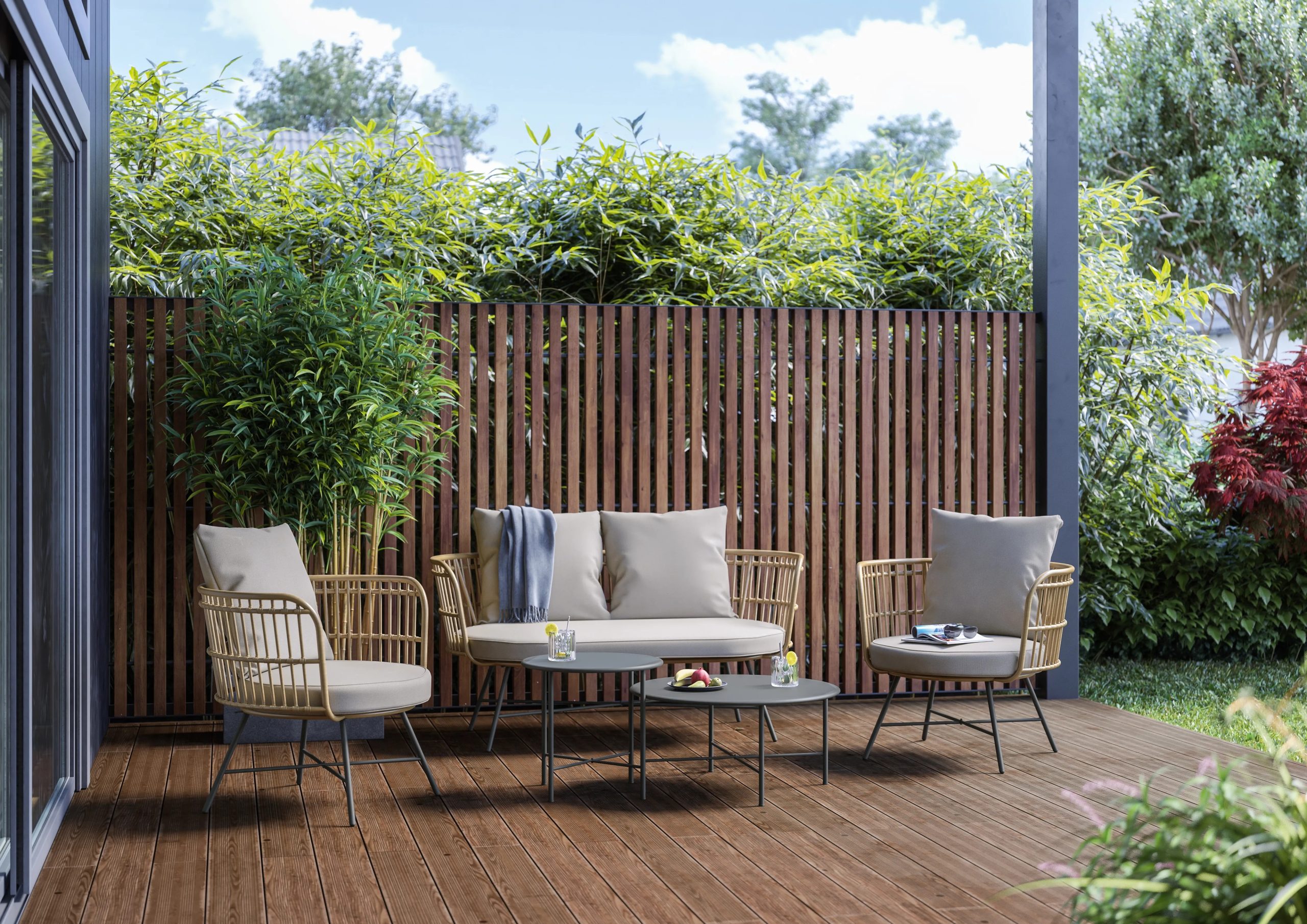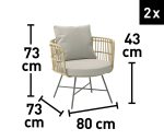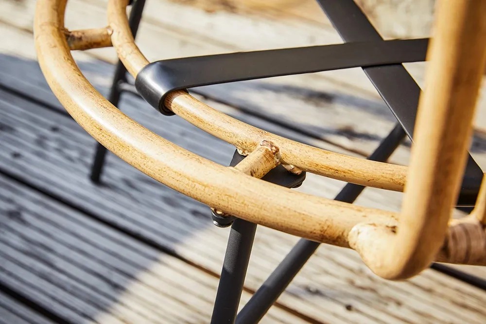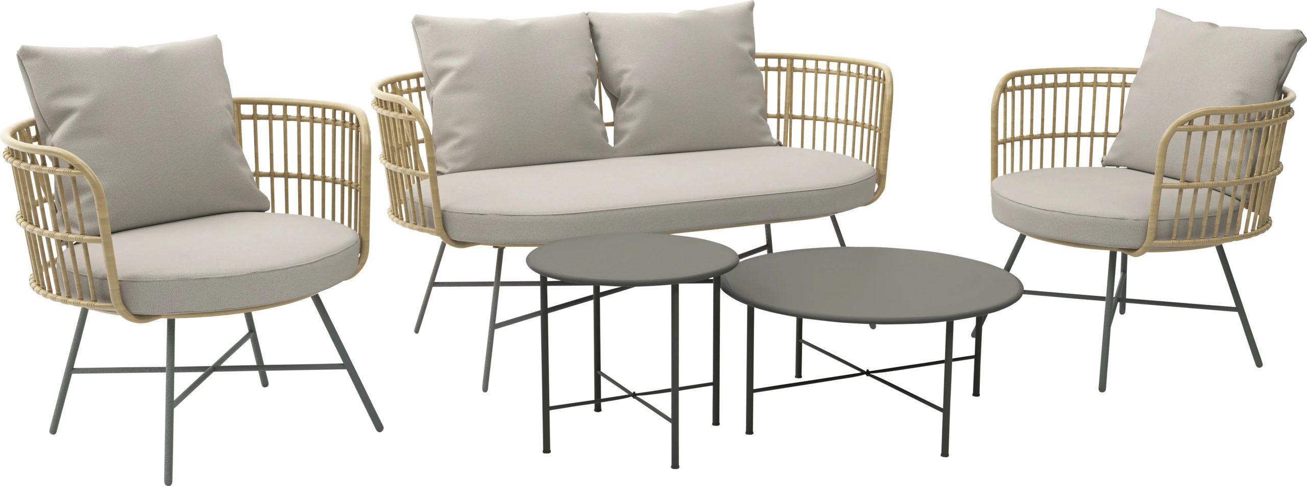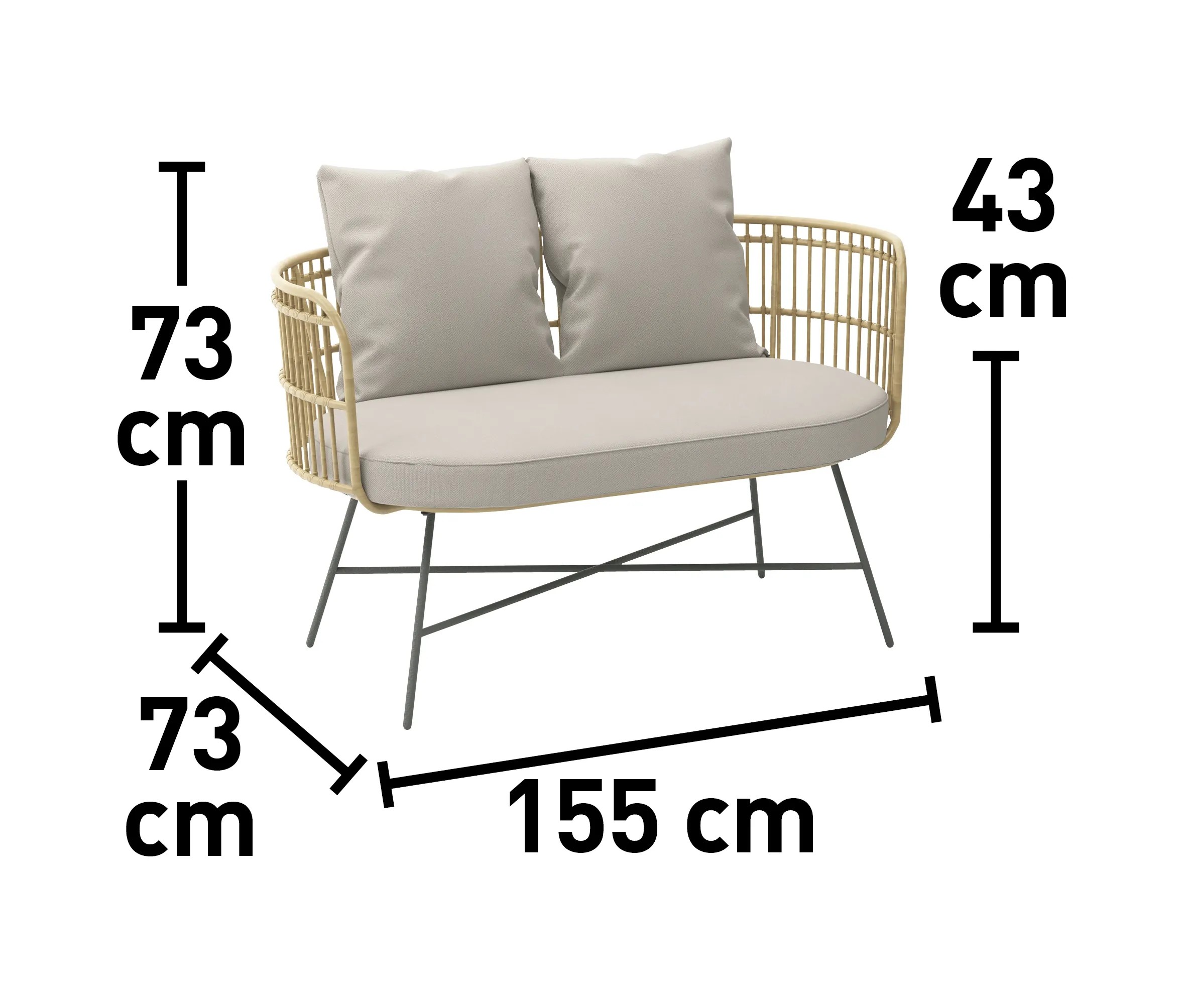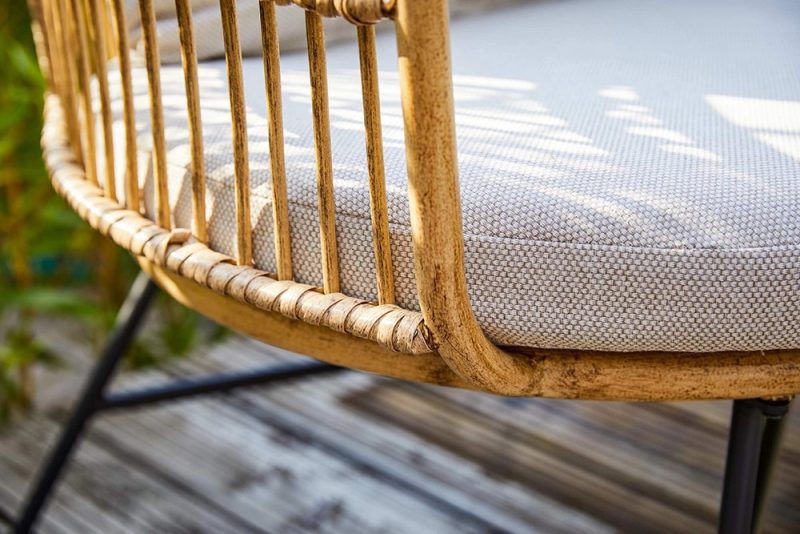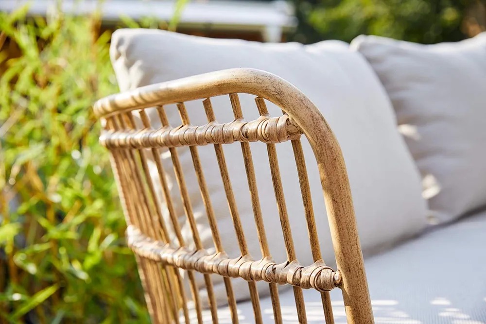 Elementy z technorattanu nadają meblom lekkości i nawiązują wyglądem do naturalnych tworzyw. Dopasowane w spokojnym beżowym kolorze, dodają wrażenia przytulności. Zestaw jest stylowym elementem, który można łatwo dopasować do wielu przestrzeni.