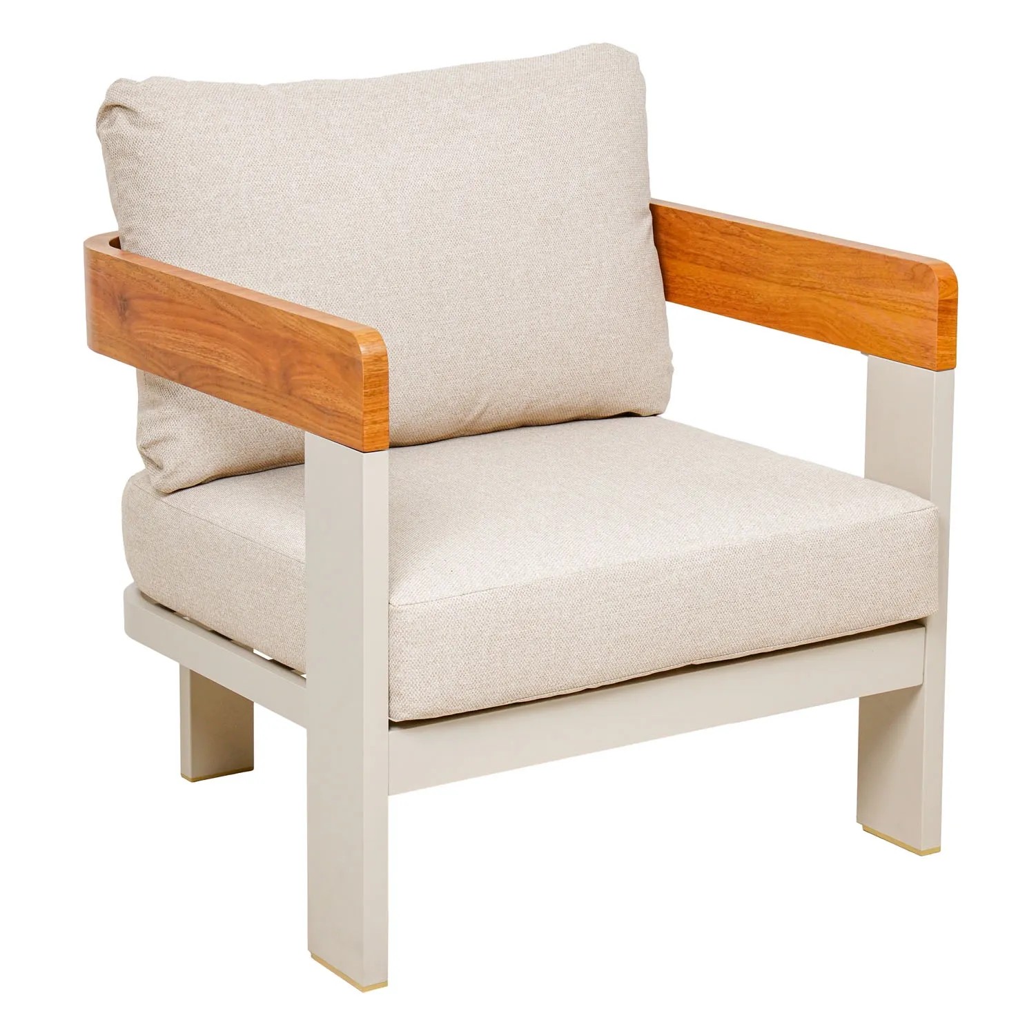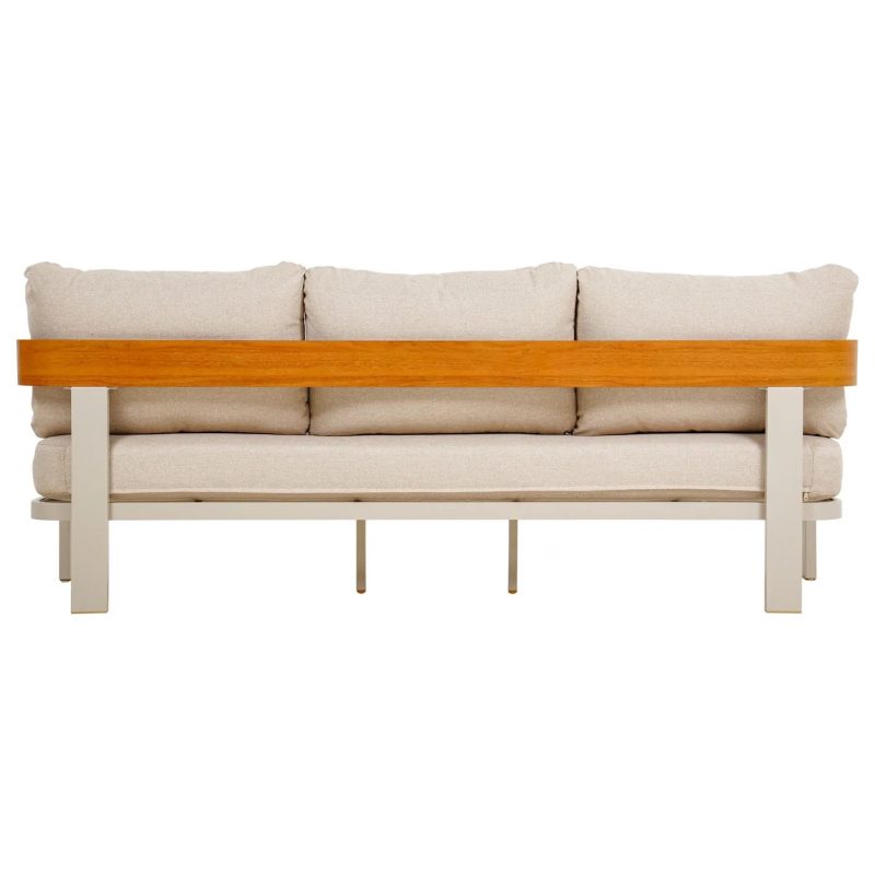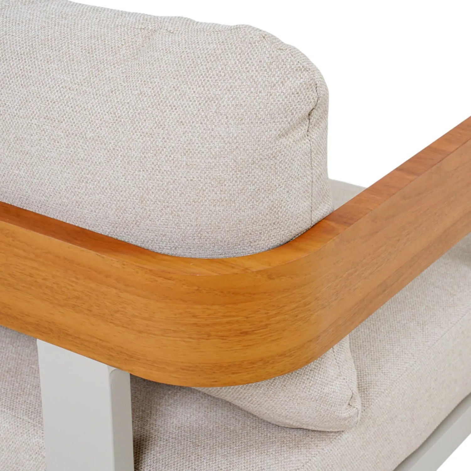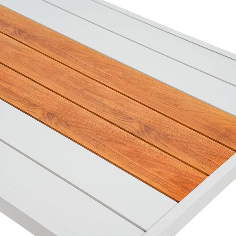 Rama mebli została wykonana z aluminium malowanego proszkowo, które odznacza się wysoką trwałością i odpornością na warunki atmosferyczne. Lekka konstrukcja mebli sprawia, że są łatwe do przenoszenia. Wykończenie w innowacyjnej technologii heat transfer imituje wygląd naturalnego drewna.