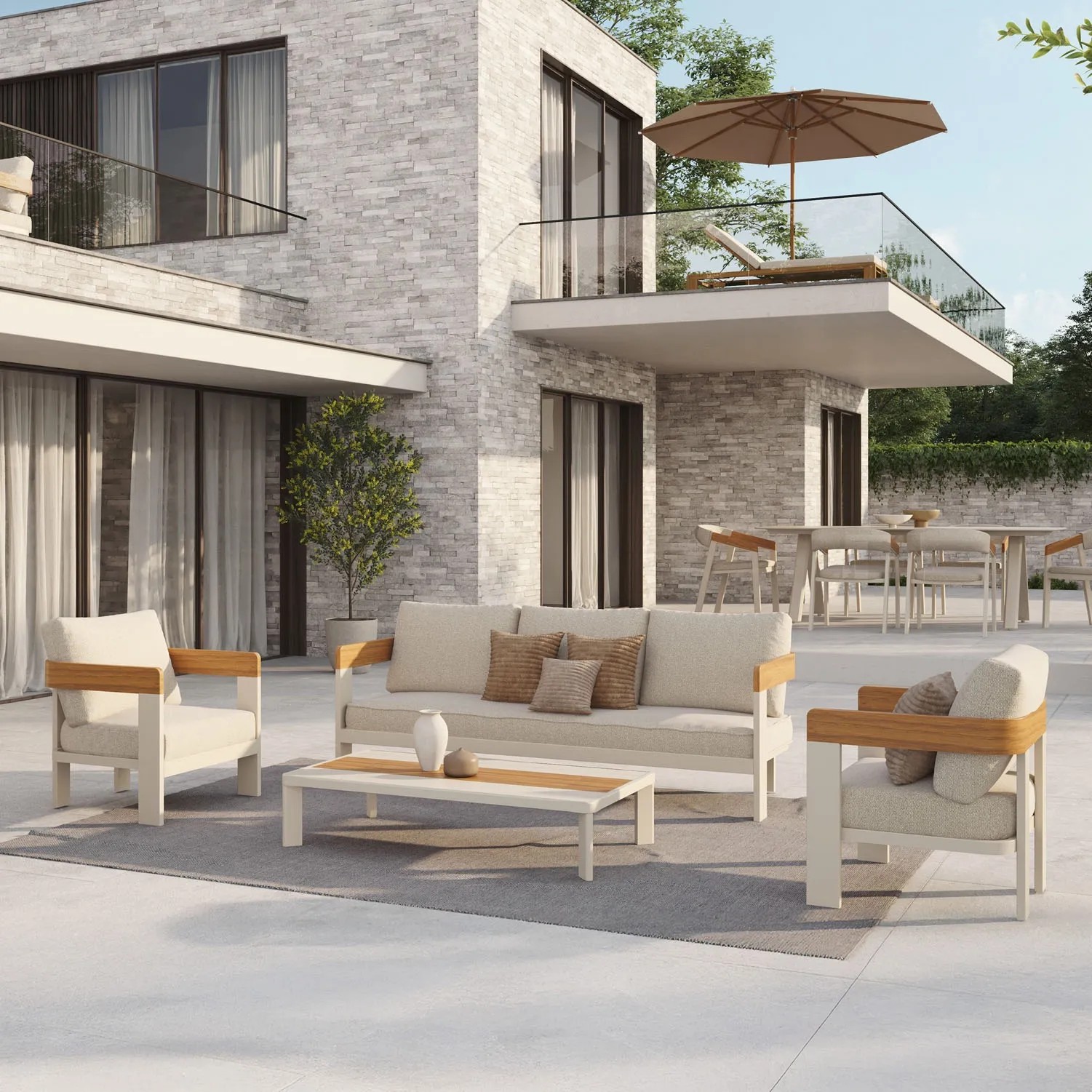 Ten 4-elementowy zestaw mebli ogrodowych idealnie sprawdzi się do organizowania spotkań rodzinnych czy towarzyskich w Twoim ogrodzie lub tarasie. W skład zestawu wchodzi sofa, 2 fotele oraz stolik kawowy, co łącznie tworzy 5 miejsc siedzących.