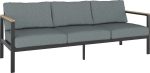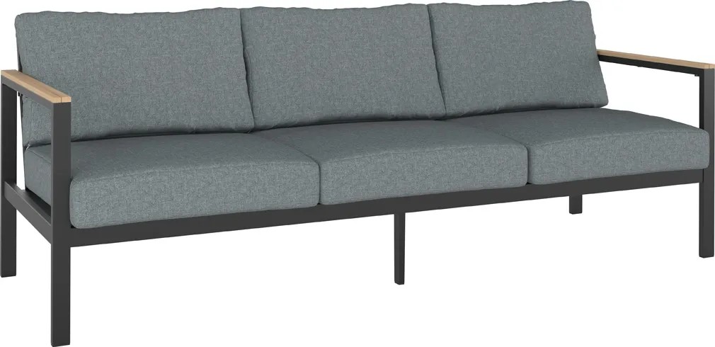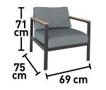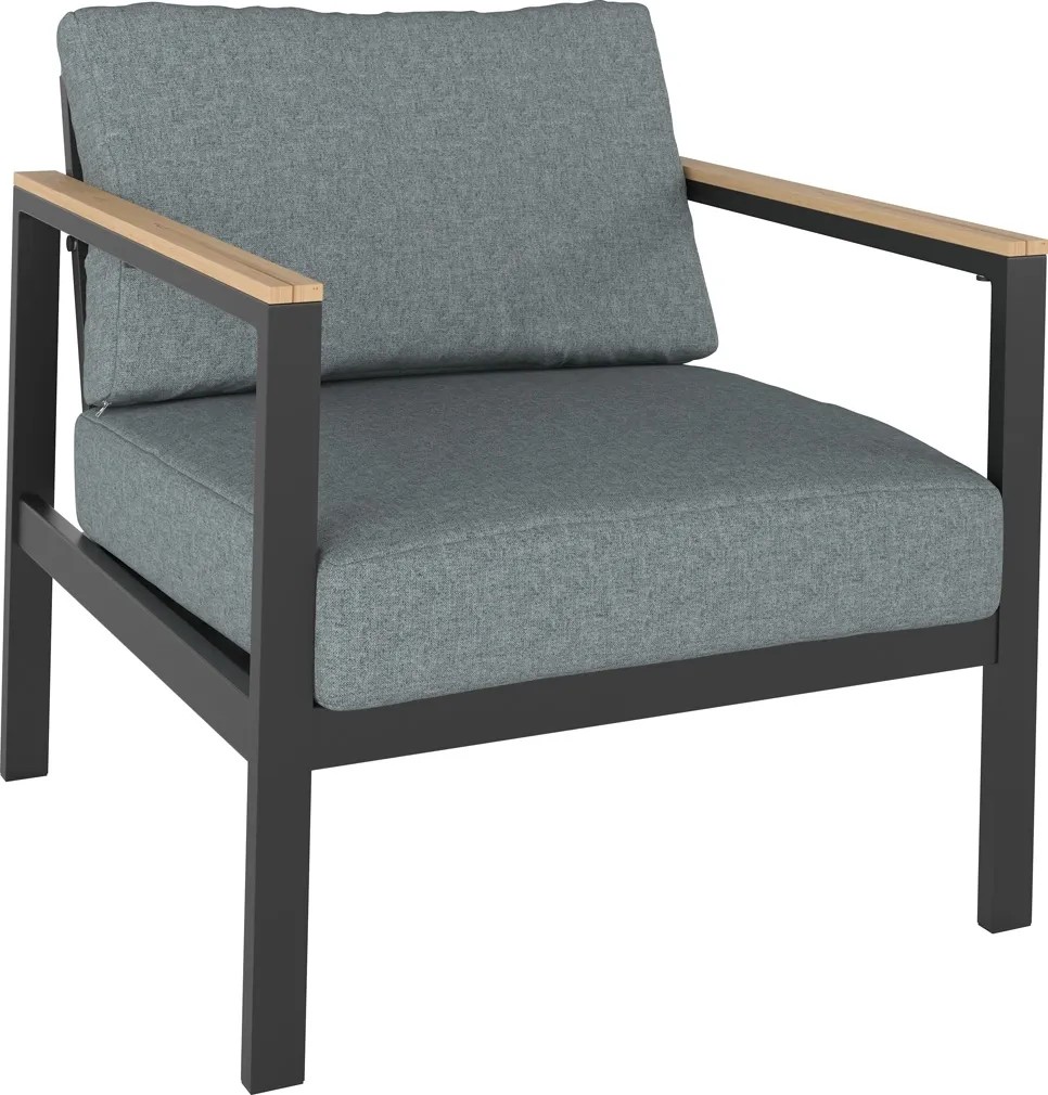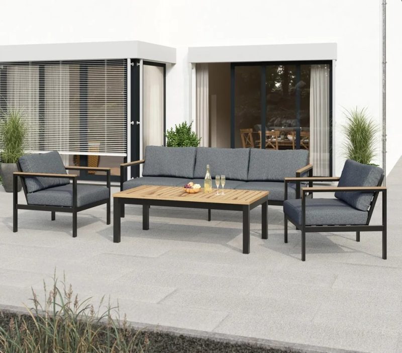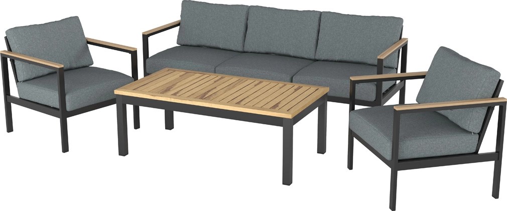 Zestaw Roberval zwraca na siebie uwagę modnym obecnie połączeniem szarości z kolorystyką drewna. Grafitowy stelaż dobrze współgra z jaśniejszymi szarymi poduszkami. Całość uzupełniają podłokietniki oraz blat w kolorze drewna. Ponadczasowe, eleganckie wzornictwo przypadnie do gustu zarówno miłośnikom klasycznego, jak i nieco bardziej nowoczesnego designu.