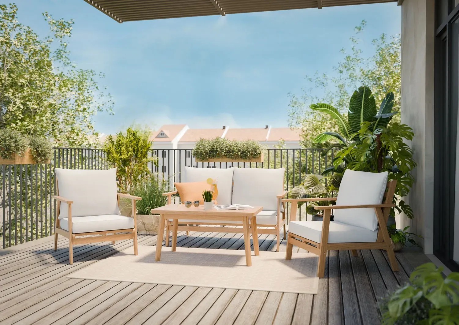 4-elementowy zestaw wypoczynkowy WOODSBORO składa się z dwuosobowej sofy, dwóch foteli i stołu. Komplet pomieści 4 osoby.