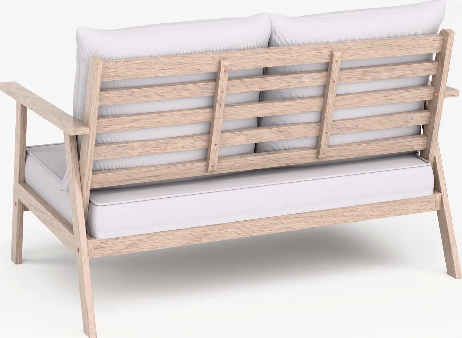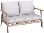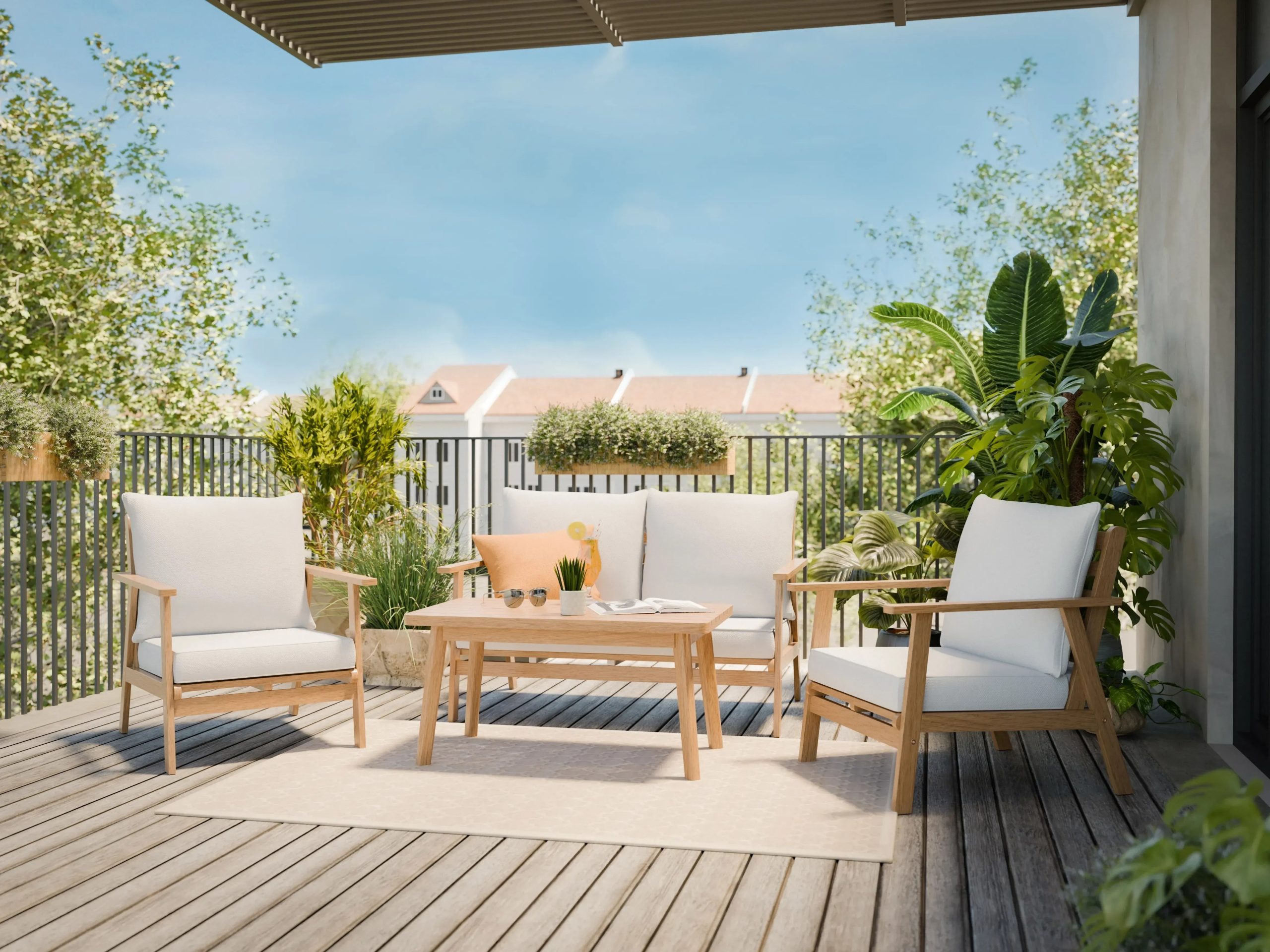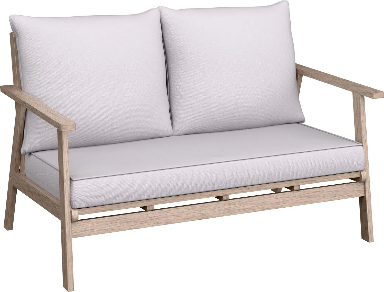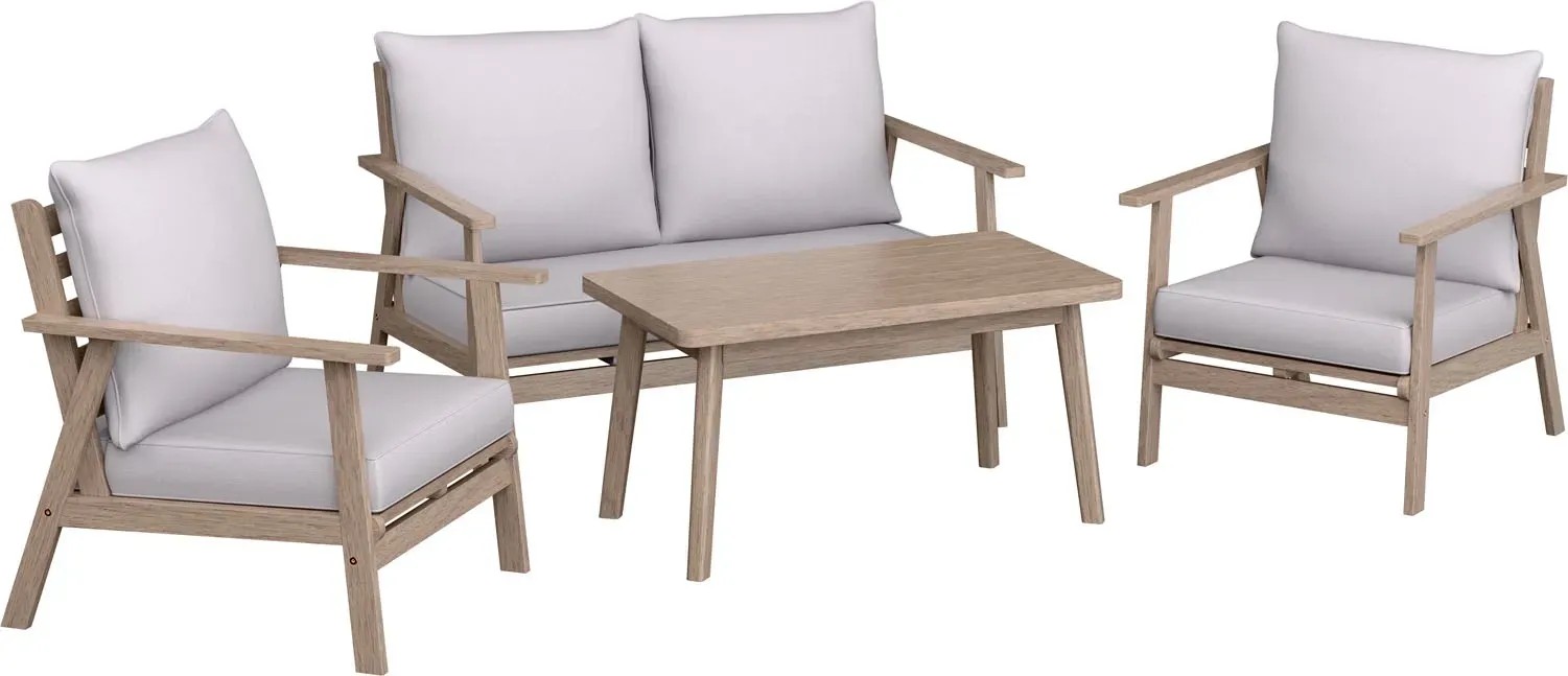 4-elementowy zestaw wypoczynkowy WOODSBORO składa się z dwuosobowej sofy, dwóch foteli i stołu. Komplet pomieści 4 osoby.