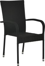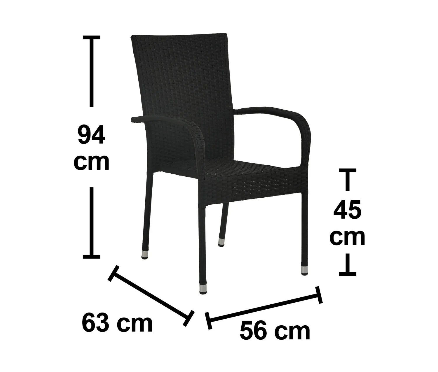 Krzesło wykonane z wytrzymałej, stalowej ramy w kolorze czarnym zapewnia stabilność i odporność na warunki atmosferyczne. Ręcznie pleciony polirattan w tym samym odcieniu nadaje mu elegancki wygląd i naturalny charakter.