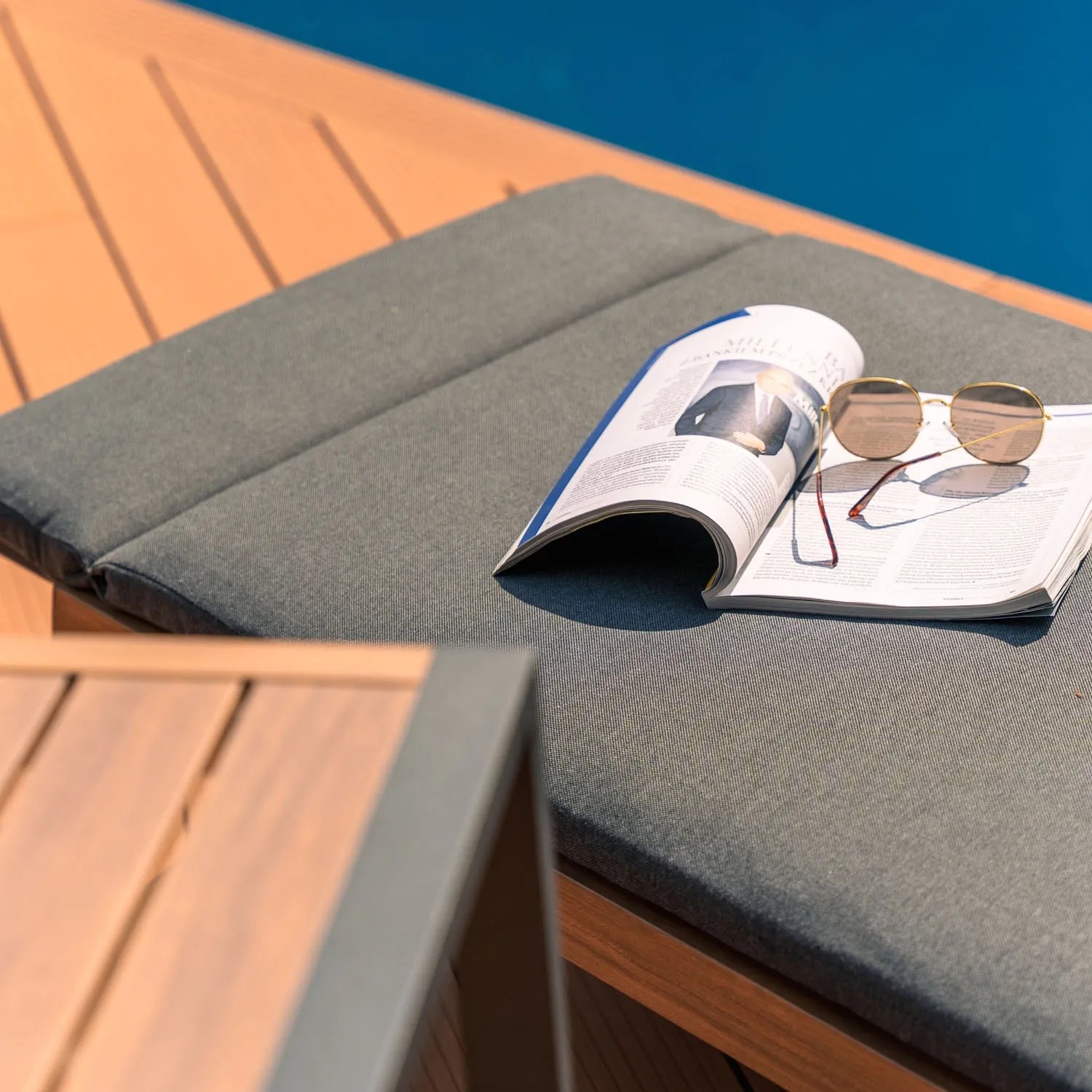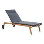 Leżak wyposażony jest w regulowane oparcie, które można dostosować do indywidualnych preferencji. Miękka poduszka ze spun poliestru jest nie tylko wygodna, ale również praktyczna – nie wchłania nadmiernie wilgoci i szybko schnie. Dodatkowo przymocowana jest do siedziska sznureczkami, dzięki czemu nie przesuwa się podczas zmiany pozycji.