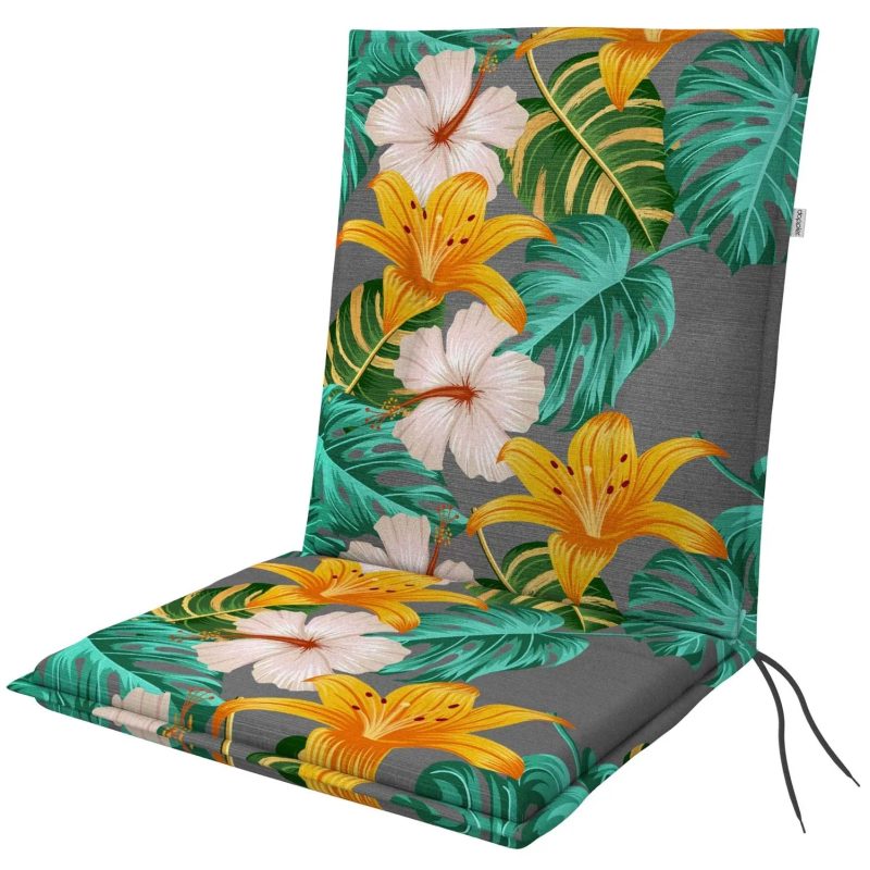 Poduszka na krzesło LIVING 5701 kwiaty wypełniona pianką poliestrową, pokrycie z poliestru 118 g/m2. Zapięcie na przesuwany klips umożliwia łatwe dopasowanie poduszki do rodzaju krzesła, a wiązania w zagięciu poduszki zapewniają stabilne mocowanie do siedziska.