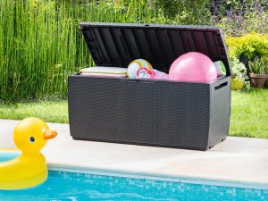 Skrzynia ogrodowa o solidnej konstrukcji wykonana z wysokiej jakości tworzywa sztucznego. Posiada strukturę naturalnego rattanu.